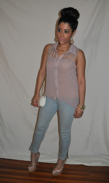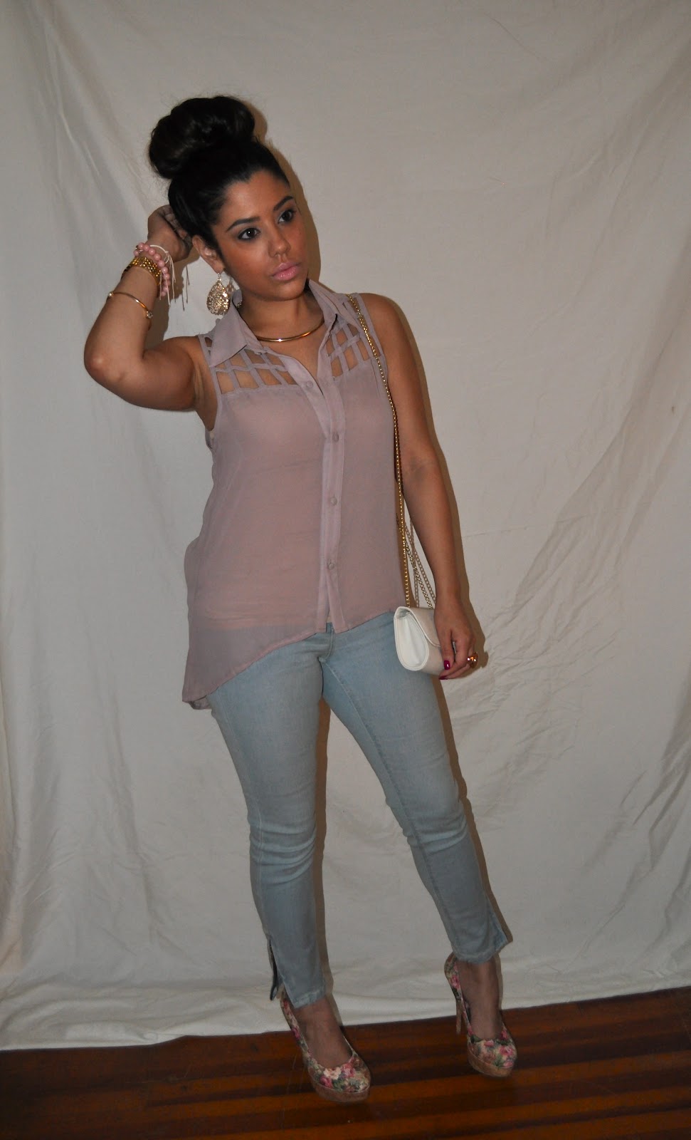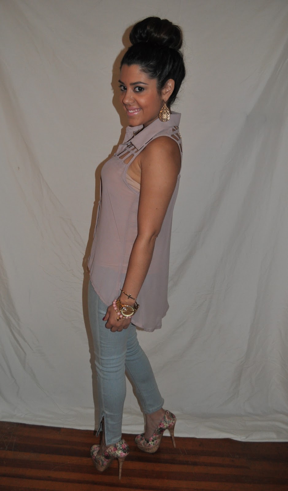 I got this shirt a month or two ago and I’ve been patiently waiting to wear it. I love the cutouts on the top. It adds a really cool effect to the shirt. It’s also high low. Since it’s super see through and I didn’t want to show my bra, I have on a simple nude tank underneath.